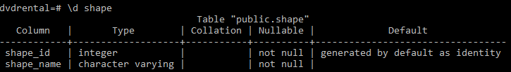 ALTER COLUMN shape_id SET GENERATED BY DEFAULT;The following command describes the structure of the shape table in the psql tool: