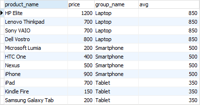 For instance, the following query returns the product name, the price, product group name, along with the average prices of each product group.